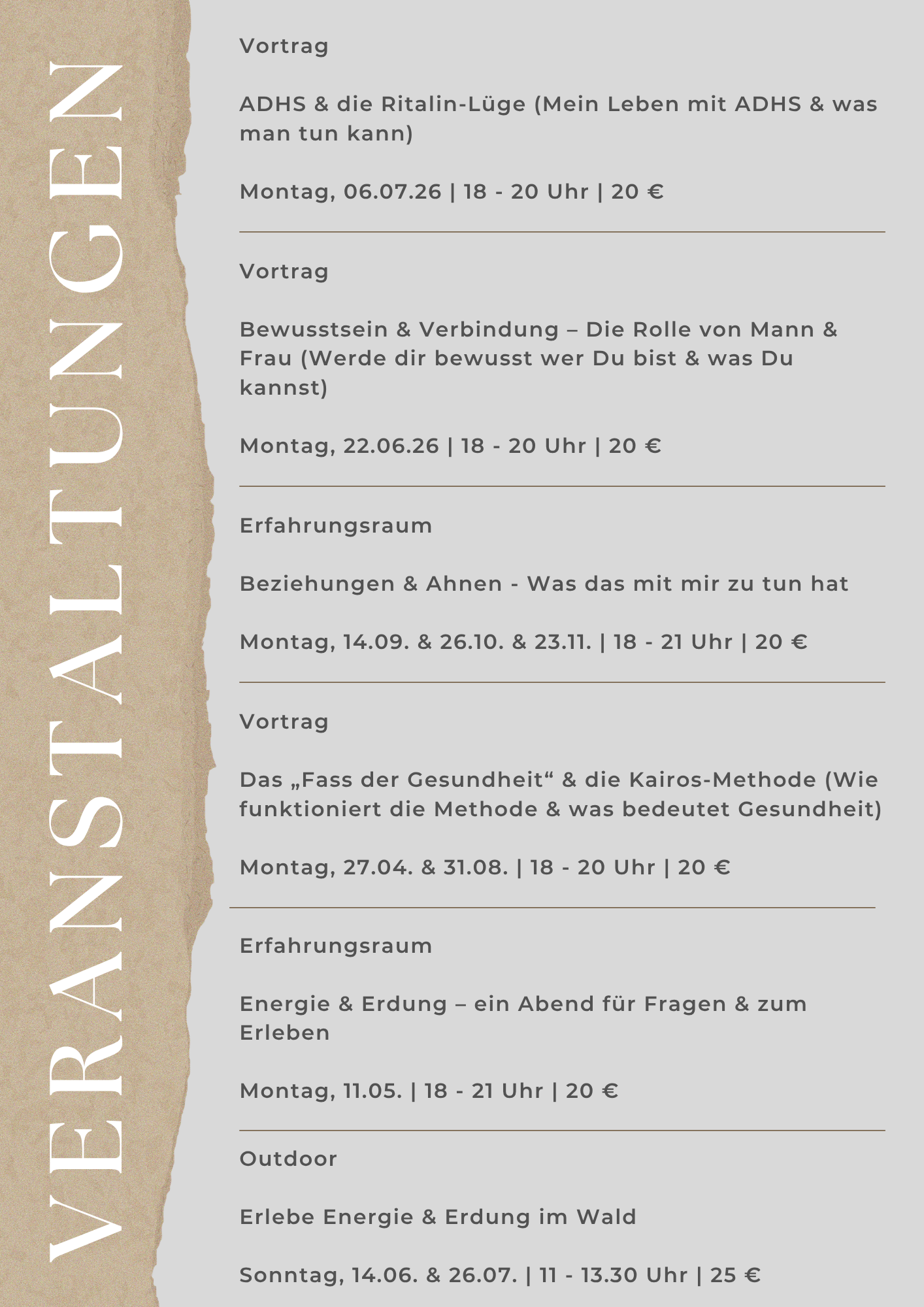 Wir verbinden therapeutische Körperarbeit, energetische Begleitung, Coaching, seminarbasiertes Naturerleben und Rituale zu einem tiefenwirksamen Gesamtkonzept. Im Fokus steht die Rückverbindung mit der eigenen Kraft, dem Körper und der Seele – jenseits schulmedizinischer oder kassenärztlicher Systeme.